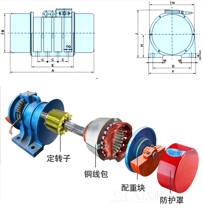YZUL型立式振動電機是動力源與振動源結(jié)合為一體的激振源,振動電機是在轉(zhuǎn)子軸兩端各安裝一組可調(diào)偏心塊,利用軸及偏心塊高速旋轉(zhuǎn)產(chǎn)生的離心力得到激振力。由電機本身運行產(chǎn)生易于調(diào)整的水平、垂直、傾斜等方向多元激振力,形成物料的快速平面分散、中心聚集、平面旋轉(zhuǎn)、三維旋轉(zhuǎn)等多種運動方式,用于控制排料速度、處理精度等機械性能指標(biāo),以其獨特的結(jié)構(gòu)特點適應(yīng)于不同的機械對振動源的要求。