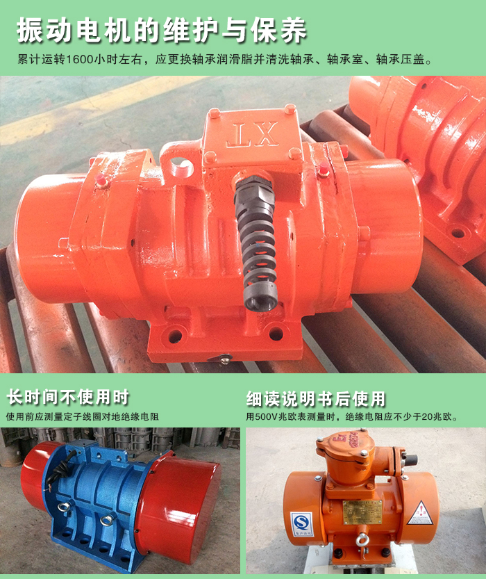 振動(dòng)電機(jī)運(yùn)轉(zhuǎn)過程中,必須注意軸承的潤(rùn)滑。在正常工作條件下,累計(jì)運(yùn)轉(zhuǎn)1600小時(shí)左右,應(yīng)更換軸承潤(rùn)滑脂并清洗軸承、軸承室、軸承壓蓋。